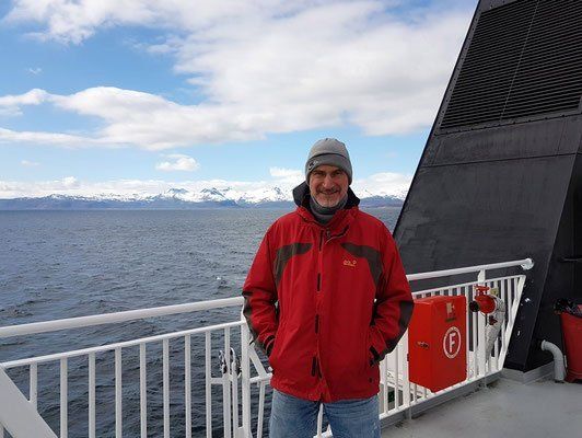 Morgens aufgewacht und etwas besser gefühlt. Gott sei Dank! Wir frühstücken in Ruhe und starten dann Richtung Bognes. Um Fauske die Landschaft ist wirklich sehr sehr schön. In Fauske halten wir an und suchen eine Bank und gehen in einem Einkaufscenter Taschentücher, Labello, Zewarollen (das Leck im Bad erfordert einige Rollen Zewa) einkaufen und die Hoffnung hier in der Apotheke Wick Vapurub zu bekommen stirbt nun endgültig. Nach Fauske zieht sich wieder der Weg nach Bognes.. immer schnurgeradeaus... das ist etwas ermüdend, aber wir freuen uns nun endlich heute auf den Lofoten anzukommen! In Bognes warten wir eine gute halbe Stunde auf die Fähre und die Überfahrt geht zügig... es ist sehr kalt auf dem Deck und ich gehe für ein Foto nur ganz kurz raus, den kalten Wind kann ich nun gar nicht gebrauchen. Michael isst seinen Hot Dog, den er schon das letzte mal gegessen hat :-). Ich genieße die Überfahrt und nehme auf... alles festhalten, wer weiß, wann wir wieder hier sind. Ich bin so glücklich ...Nach der Ankunft fahren wir bis Svolvär, hier kaufen wir noch einmal ein paar Kleinigkeiten ein. Salat und etwas Gemüse. Dann geht es weiter in Richtung Eggum. Der Platz ist voll, wir finden gerade noch ein schönes Plätzchen. Es ist sehr windig und kaaaalt! Aber das macht nichts, warm angezogen und dann machen wir einen Spaziergang zu der Kopfskulptur. Diese ist sehr interessant. Die Skulptur stellt einen Kopf dar der in verschiedenen Blickwinkeln mal auf dem Kopf steht und dann wieder ganz normal aussschaut. Das letzte mal, als wir hier waren hatten wir es verpasst, bzw nicht gewusst, deshalb mussten wir uns das jetzt unbedingt anschauen. Der Weg dahin war wunderschön, aber wie schon erwähnt, sehr windig und kalt. Wieder zurück, wärmten wir uns erstmal mit einem heißem Tee auf und dann gab es Essen. Eigentlich wollten wir heute grillen, aber bei den Temperaturen und dem Wind war gar nicht daran zu denken! Und leider können wir auch hier unsere Drohne nicht fliegen lassen. Um Mitternacht gehen wir raus und fotografieren die erste Mitternachtssonne in diesem Urlaub. Wie schön... ich sitze noch eine Weile und genieße die Zeit Michael geht heute mal früher schlafen... er ist ja auch die ganze Zeit gefahren...