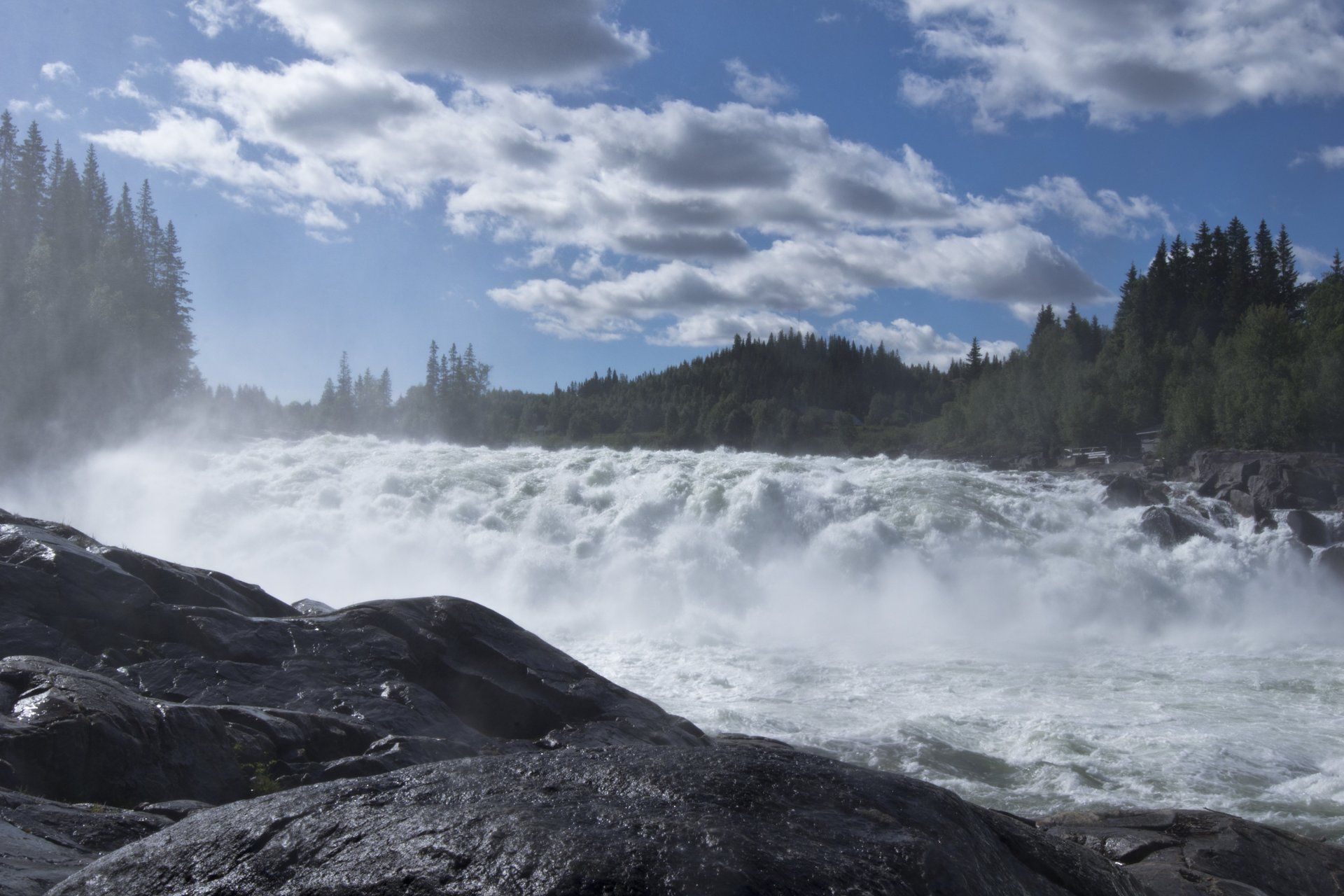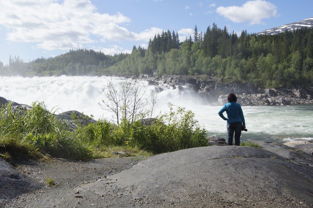 Morgens wieder früh wach.. mein Rücken.. das sollte sich den ganzen Urlaub durchziehen.. das eine oder andere mal gab es eine Tablette. Also wieder mit dem Hund raus und dann Frühstück vorbereitet. Die Sonne schien und ich war bereit... Michael nicht! Der fluchte, Urlaub und dann so früh raus.. Früh hieß dann 7:30 Uhr. Man muss aber dazu sagen, dass er in verschiedenen und unregelmäßigen Schichten arbeitet und im Urlaub einfach mal seine Ruhe haben will.. wenn da seine Perle nicht wäre.. also grummelnd am Frühstückstisch gesessen..nach dem Kaffee ging es dann besser:-) Dann ging es los, nochmal schnell Bilder am Tor zu Nord-Norge gemacht und dann ging es los. Wetter war heute super. Am Laksfossen machten wir Stopp und schauten uns dieses gigantische Naturschauspiel an. Irre, was da für Massen an Wasser runterkommen!