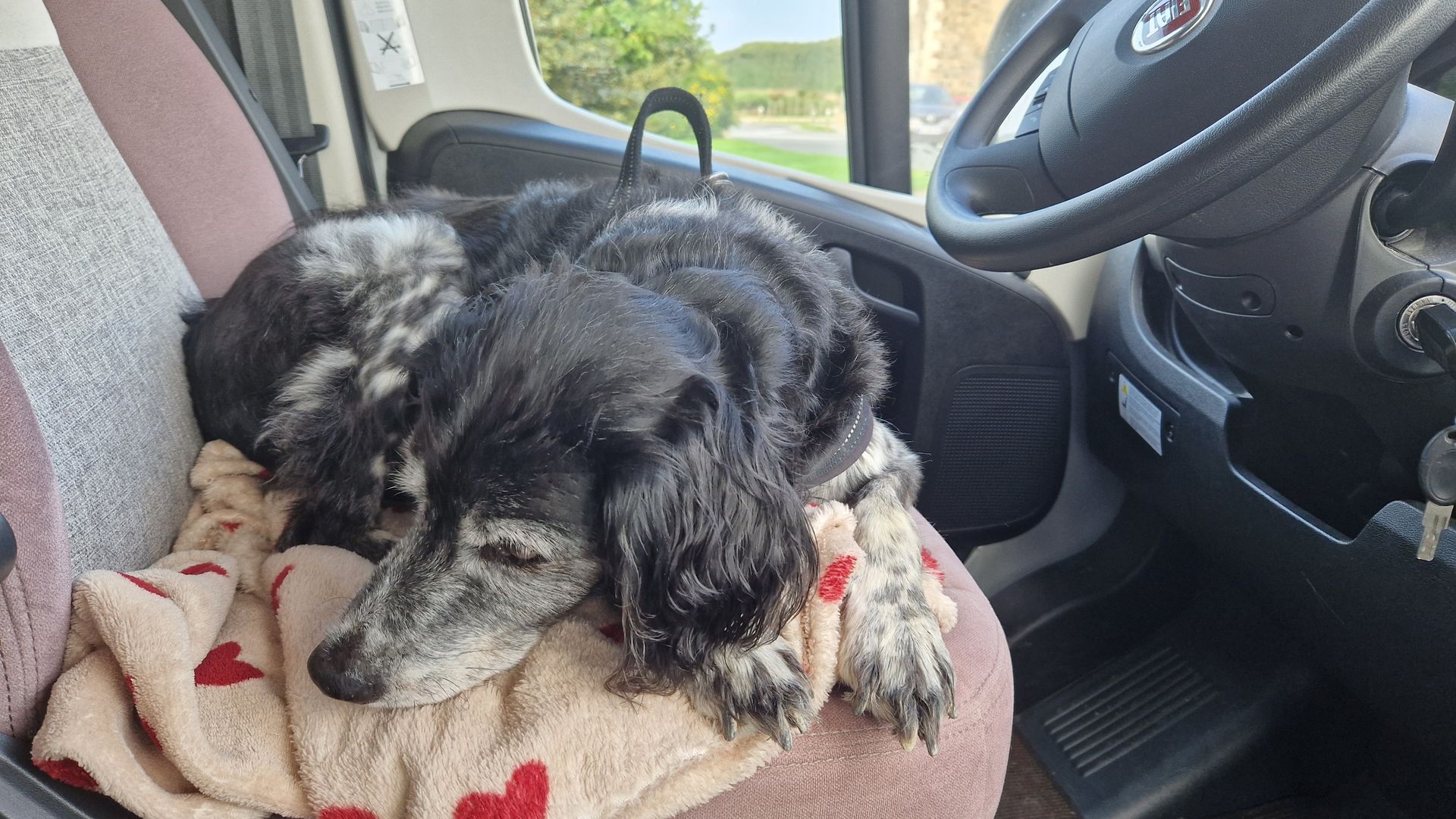 Wir übernachten hier am Parkplatz, was eigentlich verboten sit. Es stehen aber noch mehr Mobile hier und wir wagen es. Am nächsten Morgen geht Michael mit Dalton Gassi. Es dauert nicht lange und es donnert an der Tür und das immer wieder. Ich bin noch im Nachtoutfit mensch! Aber da das Klopfen ordentlich ist, mache ich vorsichtig auf. Ein Mann steht vor mir und schimpft auf französisch. Ich verstehe kein Wort. Da er aber ziemlich zornig ist, rufe ich Michael an, der natürlich nicht rangeht. Als er zurückkommt ist der Ranger noch immer da. Mir schlackern die Knie. Wir bekommen ein Platzverbot, denn hier ist es nicht erlaubt zu stehen. Die anderen Wohnmobile waren schlauer und haben morgens ihre Verdunkelungen hochgemacht, so dass es aussah als parken sie nur. Der Ranger wir aber ruhiger und wir erklären ihm, dass wir sofort abreisen. Gesagt getan...im Ort beim Bäcker halten wir erst einmal an und verschnaufen. Jetzt erst mal Frühstück. Das mache ich sicher nicht noch einmal mit. Ich hatte von Anfang an kein gutes Gefühl und wollte dort nicht stehen bleiben... aber gut, es ist ja nichts passiert.
