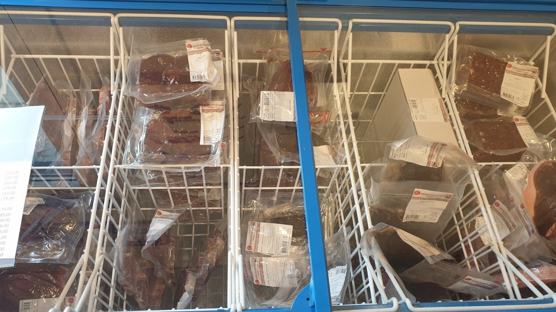 Also machen wir heute einen Fahrtag. In Jokkmokk halten wir noch einmal an. In einem kleinem Technikladen kaufen wir uns einen kleinen Stromumwandler, da der alte kaputt ist und damit ich auch am Laptop ohne Landstrom arbeiten kann, holen wir uns einen neuen, der tatsächlich deutlich besser, als der vorherige ist. Dann fahren wir noch zum Sami-Laden in Jokkmokk, den uns Alex empfohlen hat. Hier kann man Rentier und Elchfleisch kaufen. Es ist eingefroren und portioniert.