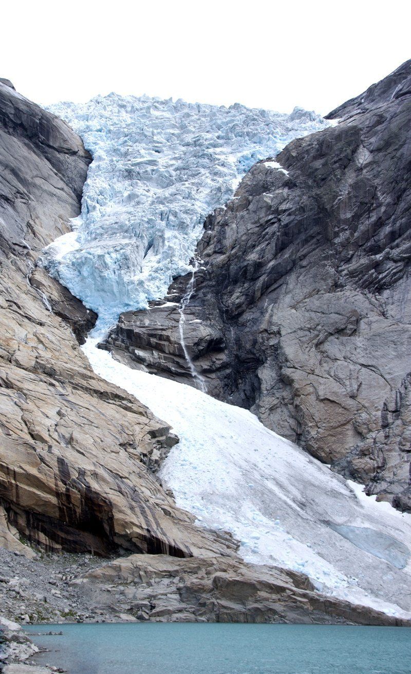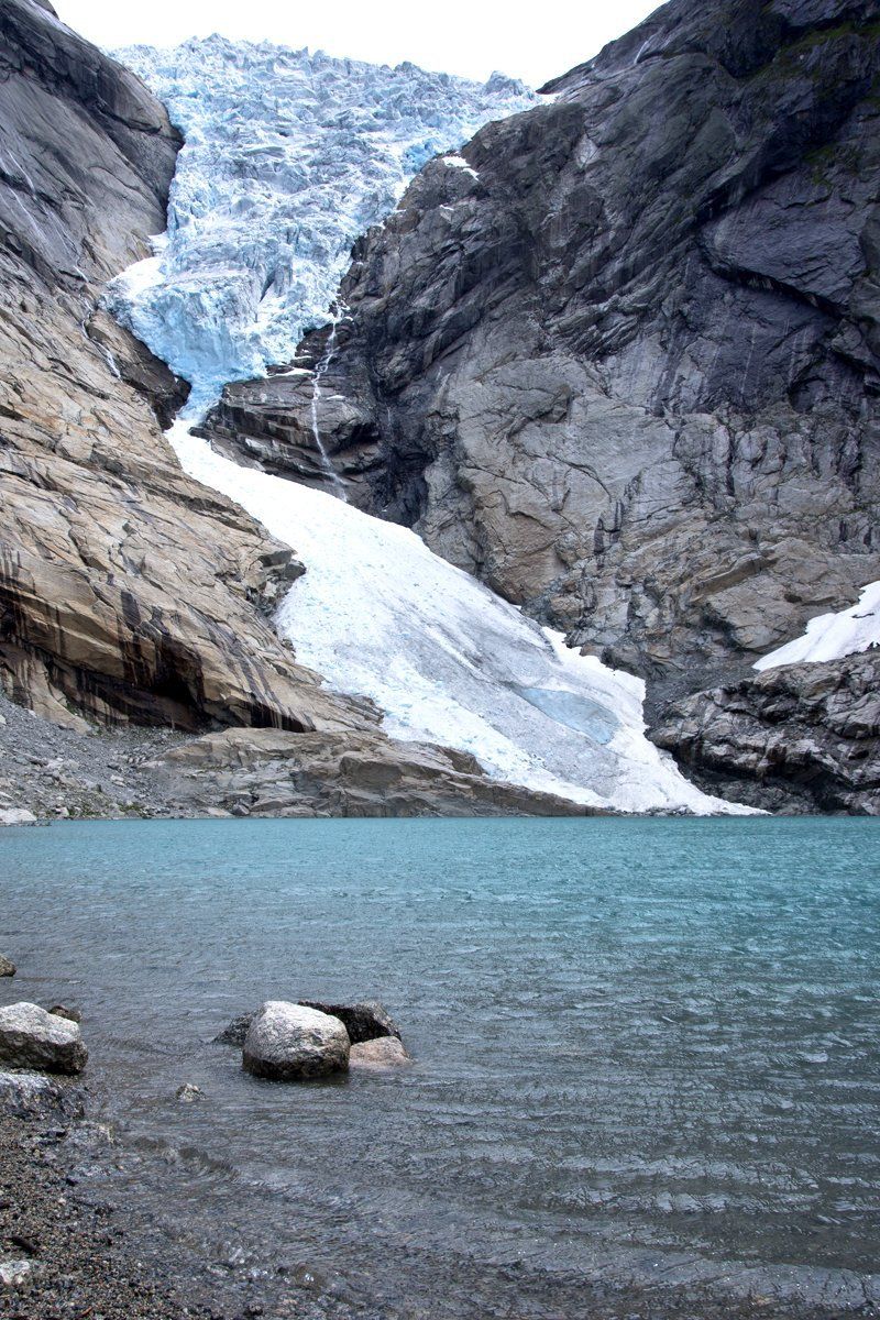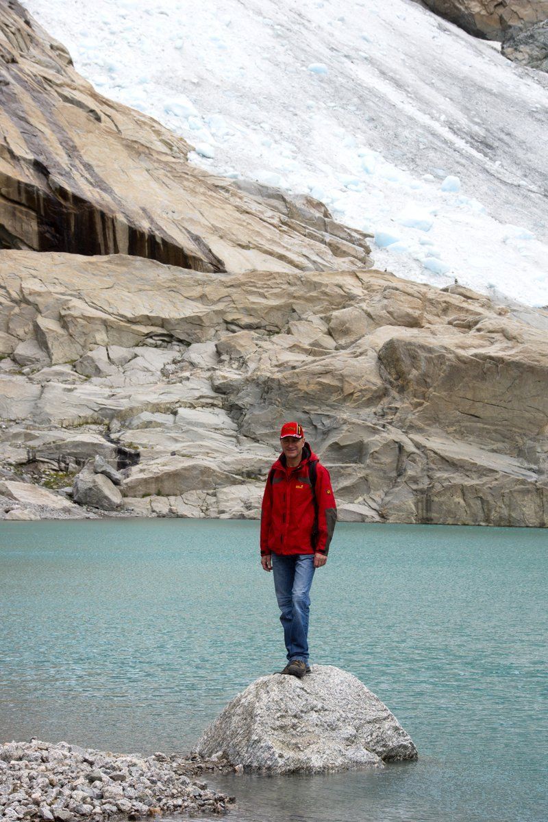 Dann fahren wir auf den Parkplatz und rüsten uns für den Wanderweg zur Zunge des Briksdalbreen. Die Tour ist sehr schön, es gibt auch kleine Shuttlecars, aber wir laufen. Wir haben gutes Wetter und es schaut alles einfach gigantisch aus. Sehr beeindruckend. Allerdings war die Gletscherzunge vor 6 Jahren (also 2006) noch bis ans Wasser, erzählt uns ein Mann. Sie ist schon sehr zurück gegangen. Aber die Geräuschkulisse war der Hammer. Das Grollen , wenn sich ein Stück vom Eis löst, ist echt laut und beeindruckend! Wir sind fasziniert. Natürlich bauen wir auch unser Steinmännchen, ob wir es jemals wiederfinden???