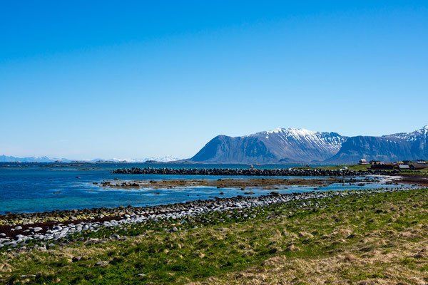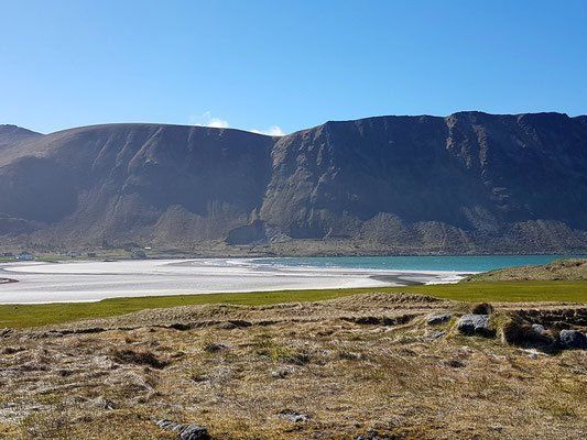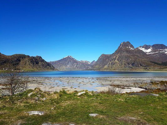 Bei Ramberg halten wir auch an und nehmen diesen herrlichen Strand auf.. eines der schönsten Strände. Dann fahren wir über Flakstad nach Fredvang und halten alles auf Bildern fest. Endlich sind wir da. Der Platz ist noch leer, was sich aber im Laufe des Nachmittages ändert, denn es ist Pfingsten und die Norweger haben frei. Gott sei Dank... sonst wäre es fast ein bisschen einsam gewesen. Und auch hier pfeifft der Wind. Es ist sehr kalt 9 Grad! Ganz klare Luft und wunderbare Aussichten, aber wirklich bitter kalt. Bei der Ankunft füllten wir unseren Wassertank auf. Wir haben gedacht wir sehen nicht richtig, der Einweiser des Wohnmobiles hat uns doch tatsächlich einen 30 meterlangen Wasserschlauch mitgegeben.. !!! Ich musste den über den halben Platz ausrollen! Wie peinlich! Das war unmöglich. Es gab einen Schlauch am Platz, aber da ging der Anschluss nicht auf und an der Rezeption war keiner.. also musste wir da durch. Gott sei Dank waren noch nicht so viele Gäste da. Das hätte man aufnehmen müssen und auf Youtube stellen... wäre ein Lacher geworden. Michael hat geflucht!