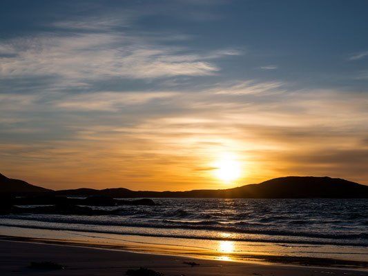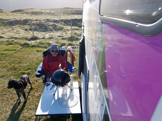 Später versuchten wir den Grill anzubekommen.. auweia die Kohle mit dem Anzünder passte irgendwie nicht. Dann noch der Wind dazu... über 1 1/2 Stunden brauchte die Kohle um richtig zu glühen. Dann kamen endlich die Steaks drauf. Was hatte ich mich auf die Steaks gefreut, hatte ich mal wirklich Appetit drauf, aber leider waren sie gar nicht so doll...:-( es musste noch einen Nachtisch geben... die ganze Warterei hatte sich gar nicht gelohnt! Wir lassen den Tag mit Rotwein ausklingen und natürlich gehen wir um Mitternacht an den Strand und fotografieren wieder die Sonne... um 01:30 Uhr geht es langsam ins Bett.