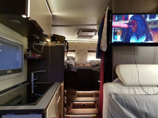 Abends gibt es dann einen Videoabend. Das Licht vom Womo ist echt schön. Viel LED .. toll gemütlich. Ein schönes Auto, wenn das mit dem Bad nicht wäre, wäre es perfekt.