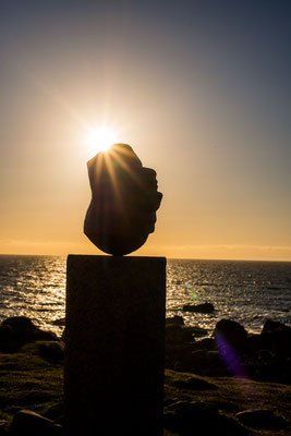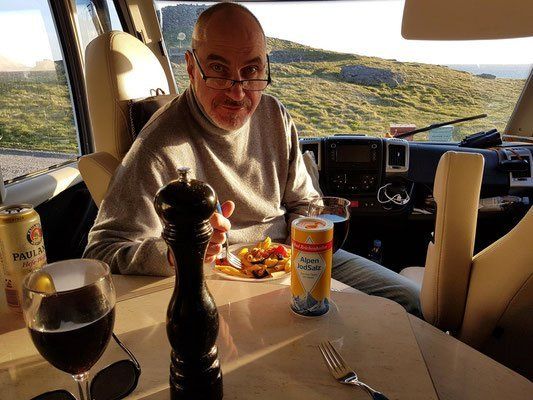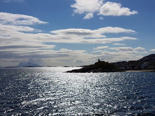 Morgens aufgewacht und etwas besser gefühlt. Gott sei Dank! Wir frühstücken in Ruhe und starten dann Richtung Bognes. Um Fauske die Landschaft ist wirklich sehr sehr schön. In Fauske halten wir an und suchen eine Bank und gehen in einem Einkaufscenter Taschentücher, Labello, Zewarollen (das Leck im Bad erfordert einige Rollen Zewa) einkaufen und die Hoffnung hier in der Apotheke Wick Vapurub zu bekommen stirbt nun endgültig. Nach Fauske zieht sich wieder der Weg nach Bognes.. immer schnurgeradeaus... das ist etwas ermüdend, aber wir freuen uns nun endlich heute auf den Lofoten anzukommen! In Bognes warten wir eine gute halbe Stunde auf die Fähre und die Überfahrt geht zügig... es ist sehr kalt auf dem Deck und ich gehe für ein Foto nur ganz kurz raus, den kalten Wind kann ich nun gar nicht gebrauchen. Michael isst seinen Hot Dog, den er schon das letzte mal gegessen hat :-). Ich genieße die Überfahrt und nehme auf... alles festhalten, wer weiß, wann wir wieder hier sind. Ich bin so glücklich ...Nach der Ankunft fahren wir bis Svolvär, hier kaufen wir noch einmal ein paar Kleinigkeiten ein. Salat und etwas Gemüse. Dann geht es weiter in Richtung Eggum. Der Platz ist voll, wir finden gerade noch ein schönes Plätzchen. Es ist sehr windig und kaaaalt! Aber das macht nichts, warm angezogen und dann machen wir einen Spaziergang zu der Kopfskulptur. Diese ist sehr interessant. Die Skulptur stellt einen Kopf dar der in verschiedenen Blickwinkeln mal auf dem Kopf steht und dann wieder ganz normal aussschaut. Das letzte mal, als wir hier waren hatten wir es verpasst, bzw nicht gewusst, deshalb mussten wir uns das jetzt unbedingt anschauen. Der Weg dahin war wunderschön, aber wie schon erwähnt, sehr windig und kalt. Wieder zurück, wärmten wir uns erstmal mit einem heißem Tee auf und dann gab es Essen. Eigentlich wollten wir heute grillen, aber bei den Temperaturen und dem Wind war gar nicht daran zu denken! Und leider können wir auch hier unsere Drohne nicht fliegen lassen. Um Mitternacht gehen wir raus und fotografieren die erste Mitternachtssonne in diesem Urlaub. Wie schön... ich sitze noch eine Weile und genieße die Zeit Michael geht heute mal früher schlafen... er ist ja auch die ganze Zeit gefahren...