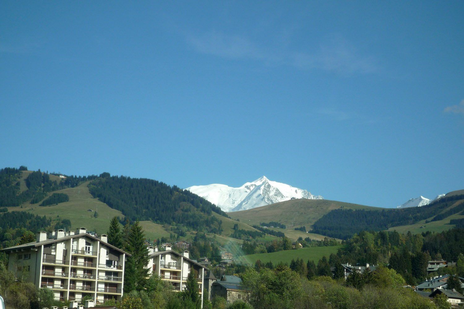 Nachts hat es geregnet, aber morgens war wieder strahlend blauer Himmel. Wir schauen natürlich auf die Wetterkarte und sehen, dass es am Mont Blanc ab Mittwoch schön werden soll. Also beschließen wir zum Mont Blanc zu fahren. Wir fahren die berühmte Route Napolen. Das ist auf jeden Fall empfehlenswert. Hammer Landschaften begleiten uns und dazu strahlend blauer Himmel. Die Passstraße, die nach Albertville Richtung Mont Blanc führt, fordert mir wiedermal als Beifahrerin mit Höhenangst, alles ab! Man man man... irgendwann sehe ich dann von weitem den berühmten Mont Blanc. Ich nehme es mal aus dem Fenster auf, aber die gewaltige Größe kommt auf dem Bild doch nicht so rüber. Michael sucht einen Campingplatz in der Nähe des Berges heraus, jedoch finden wir keine Einfahrt. Überall stehen Durchfahrtverbot-Schilder. Michael ruft dort an, ich finde das ja immer mutig, ohne Französischkenntnisse anzurufen:-) aber er kann wenigsten perfekt Englisch! Ich nicht mal das... wir erfahren, dass der Platz zu ist und es nur noch einen einzigen Platz am Mont Blanc gibt. Wir müssen wieder ein Stück zurück und finden dann den Platz, Gott sei Dank hatte der andere Platz zu, denn der hier lag direkt unter den zwei Gletscherzungen des Mont Blanc und der Berg direkt oben drüber. Wirklich schön. Wir lernen ein nettes älteres Ehepaar kennen, die in einem kleinen Mercedesbus campen. Ich bin wieder erstaunt wie das so geht, nee das wäre nix für mich und die machen das echt toll.