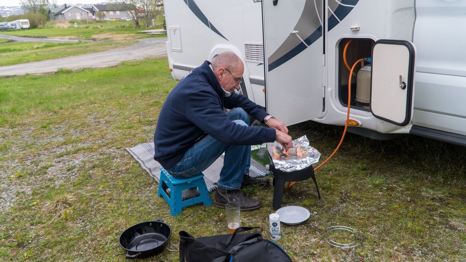 Danach geht es weiter, heute lässt es sich gut fahren. Irgendwann müssen wir mit der Fähre nach Bognes fahren und da kämpfe ich echt mit den Tränen, denn von hier ist man in eine guten 3/4 Std auf den Lofoten und mein Herz schlägt einfach für diese Region dort oben, wo wir im letzten Jahr , zum zweiten mal, wundervolle Tage verbracht haben. Aber dieses mal stehen die Wetterprognosen für Südnorwegen so gut, dass wir uns dort unten noch einige Orte anschauen wollen. Deswegen heißt es vorbei fahren an der Fähre zu den Lofoten... es fällt mir wirklich sehr schwer. Letztes Jahr, um die gleiche Zeit, lag hier überall Schnee. Dieses Jahr ist alles grün, null Schnee. Es ist deutlich wärmer, als im letzten Jahr. Gegen 19 Uhr kommen wir am Saltstraumen an, gehen noch kurz einkaufen und fahren dann auf den Parkplatz am Saltstraumen. Wir schnappen uns die Kamera und laufen runter zum Fluss, alles sehr schön angelegt hier. Am Parkplatz steht no Camping...gut wir laufen jetzt erst einmal runter zum Fluss. Naja schaut schon ganz gut aus, aber so richtig spektakulär, wie ich es schon in anderen Videos gesehen habe, ist es nicht. Wir überlegen, ob wi auf dem Parkplatz bleiben.. kein anderes Mobil steht dort.. also entscheiden wir uns auf einen CP zu fahren. Es gibt zwei hier.. der CP Elvegard ist etwas entfernt, scheint uns aber der schönere Platz zu sein und wir bleiben da. Der sehr nette Inhaber weist uns ein und dann geht es ans Essen machen. Heute hatten wir die 4000 km Marke überschritten und Michael bekommt erst einmal ein Bier!!! Dann grillen wir Lachs und machen noch ein paar Aufnahmen. Ich bin etwas melancholisch weil wir keine Mitternachtssonne mehr gesehen haben... entweder war das Wetter nicht gut, oder wie jetzt kommen ein par Schleierwolken und ein paar Berge sind auch da.. hm... schade, denn morgen verlassen wir ja wieder den Polarkreis... Übrigens der Platz kostet 340 kr. ist also ziemlich teuer, soll auch der teuerste Platz in diesem Urlaub bleiben.
