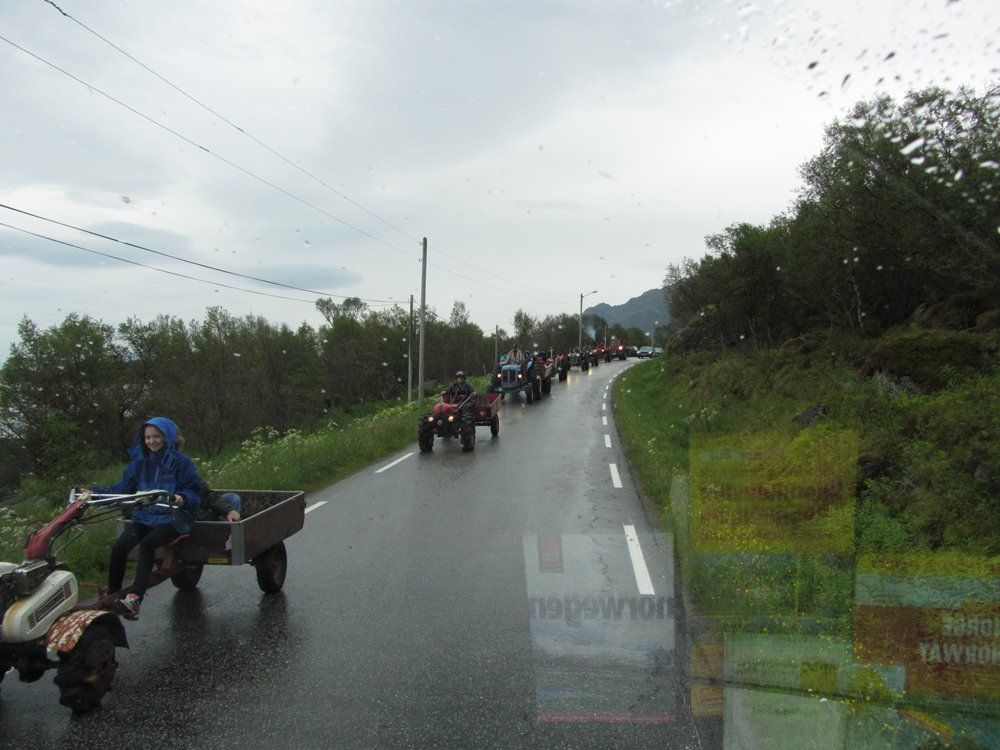 Leider spielte nun das Wetter überhaupt nicht mehr mit... es regnete und es war arschkalt! Es hätte ja wenigstens noch einen Tag warten können mit dem Regen , denn heute war Mittsommernacht! So ein Mist... ein riesiger Holzhaufen wurde auf dem CP aufgebaut, der leider am Abend nicht angezündet werden konnte, weil es so stark geregnet hat. Das war wirklich ehct schade und wir mussten uns Mühe geben. keine schlechte Laune zu bekommen... wir kamen dann auf die glorreiche Idee, den Tag zum Wäsche waschen zu nutzen... was allerdings nicht wirklich eine gute Idee war, denn es war Garderobe, die nicht in den Trockner gehörte.. somit wurde das Wohnmobil auch noch mit hängender Wäsche geschmückt! Es sah aus wie bei den Zigeunern! Und die Sachen haben ganze 4 Tage gebraucht, bis sie trocken waren... da waren wir schon in Schweden:-) neben der hängenden Wäsche wurde auch noch gekocht... :-) es gab Fleichkäse und Spiegelei, heute musste was herzhaftes her, dazu Bier. Dann rummste ich mir noch den Kopf an! Man man man...Später haben wir Hörbücher gehört und sind dann früher ins Bett, wurde ja Tatsache mal fast dunkel.. och menno letztes Jahr waren wir um die gleiche Zeit am Briksdalbreen und hatten so einen tollen Abend!.. aber beim Wetter steckt man eben nicht drin. Sollte es so bleiben reisen wir vorzeitig ab in Richtung Süd-Norwegen oder wenn es im Süden auch so schlecht ist wie hier oben. nach Südschweden. Aber eigentlich wollen wir in Norwegen bleiben...
