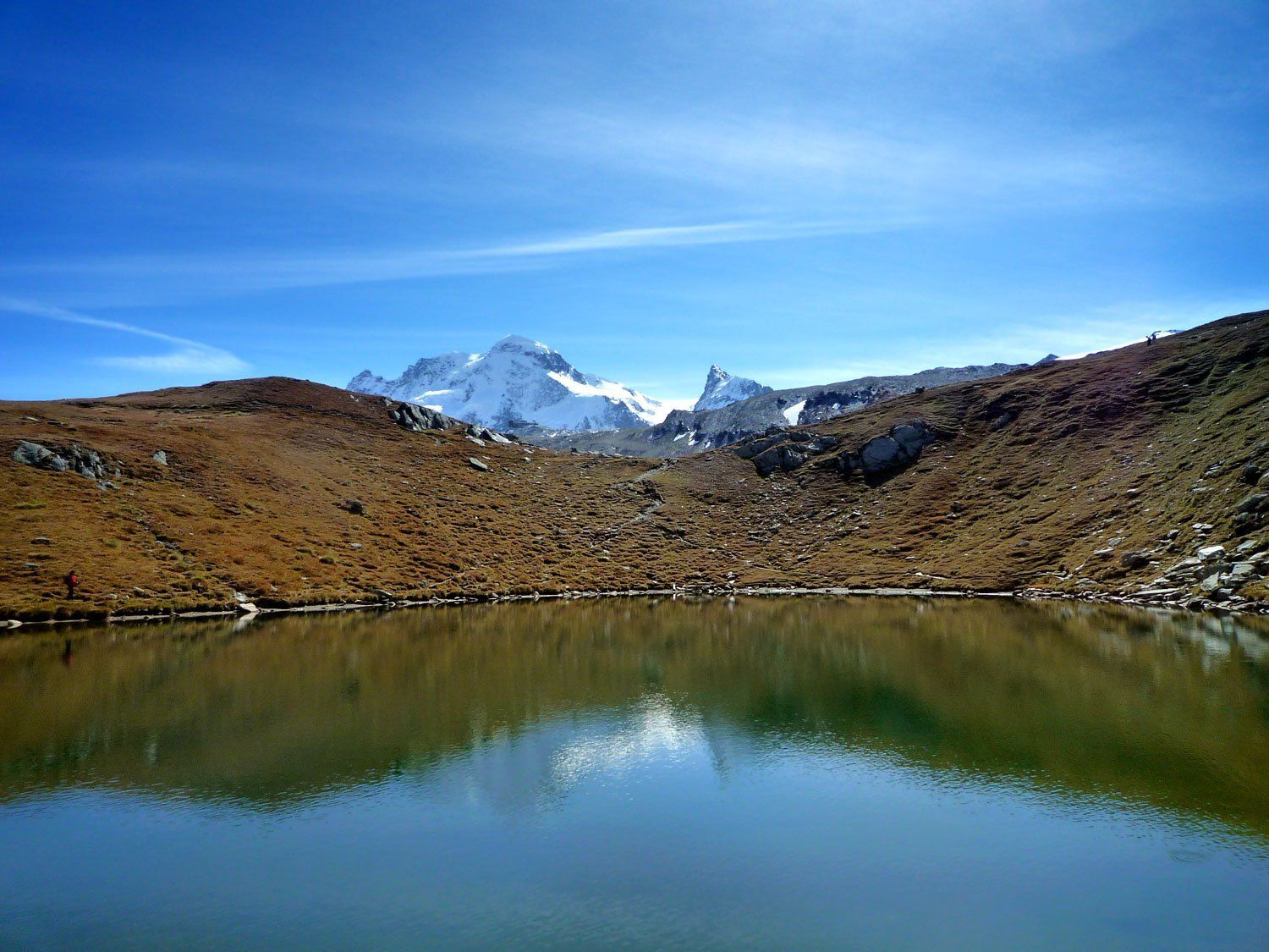 In Zermatt wechseln wir Geld und kaufen das Ticket für die Schwarzseebahn. 98 CHF für Hin und Rückfahrt. Die Bahn erreicht man nach einem ca 20 min Fußweg durch die Stadt. Das Matterhorn liegt noch in den Wolken, als wir aber oben ankommen steht der Berg im schönsten Sonnenschein.