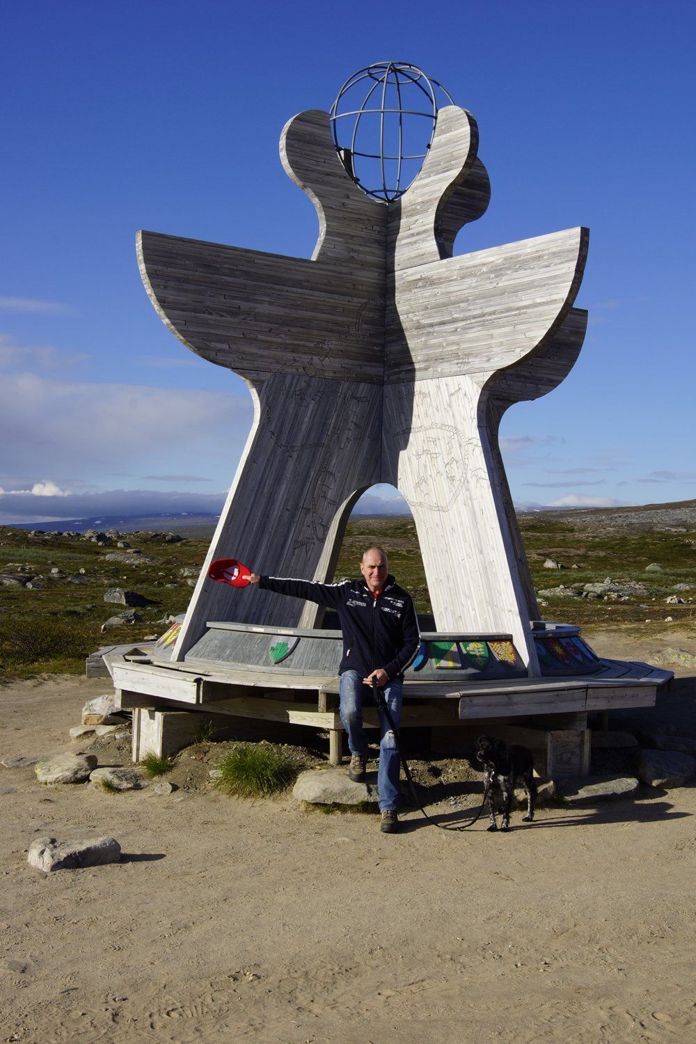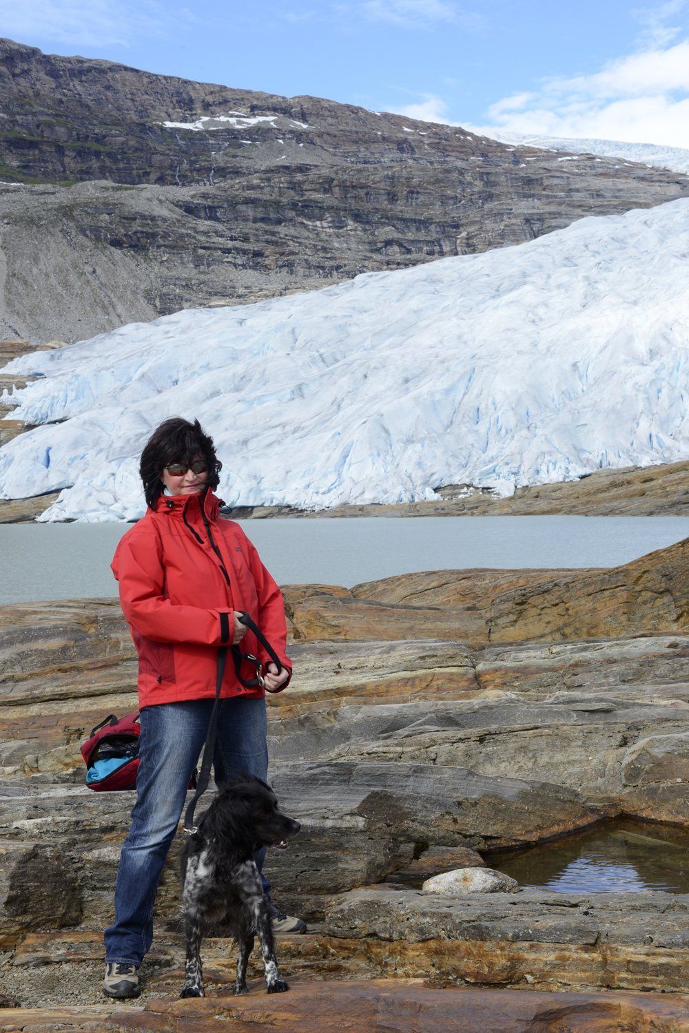 Ein sehr steiniger und nicht gut begehbarer Weg führt zum Gletscher, oder sagen wir mehrere Wege, die nicht einmal ausgeschildert sind. Wir fragten uns durch und zwischendurch wollte ich aufhören, denn es war mit Hund nicht lustig. Ein Par sagte uns es ist nicht mehr weit und nun kurz vorm Ziel wollte ich dann nicht aufgeben.. Der Gletscher ist beeindruckend, aber wir standen vielleicht 5 Minuten dort, dann mussten wir wider zurück, denn das letzte Boot fuhr ja in einer guten Stunde.. oh man.. Man kann es auch gut auf den Bildern sehen, wirklich lachen kann ich nicht!:-) zu guter letzt verliefen wir uns auch noch und wenn uns ein Paar nicht vom Boot aus gesehen hätte, wäre das Boot weg gewesen und wir hätten wahrscheinlich gar nicht mehr gewusst wo wir sind. So lotsten sie uns runter und Gott sei Dank konnten wir dann mit dem Boot zurück fahren. Nochmal 8 km laufen, das wäre eine Katastrophe gewesen. Am Platz angekomen, stärkten wir uns etwas und dann ging es doch noch einmal weiter.. über den Polarkreis (wieder für mich sehr beeindruckend und auch bewegend) bis zum Saltdal CP. Eigentlich hätten wir gerne irgendwo in der Prärie übernachtet, weil wir echt durch waren, aber wir mussten entsorgen und deshalb sind wir bis zum CP weitergefahren. Eine lange Tour heute.. Michael war nach dem Abendessen so fertig, dass er im Sitzen eingeschlafen ist. .