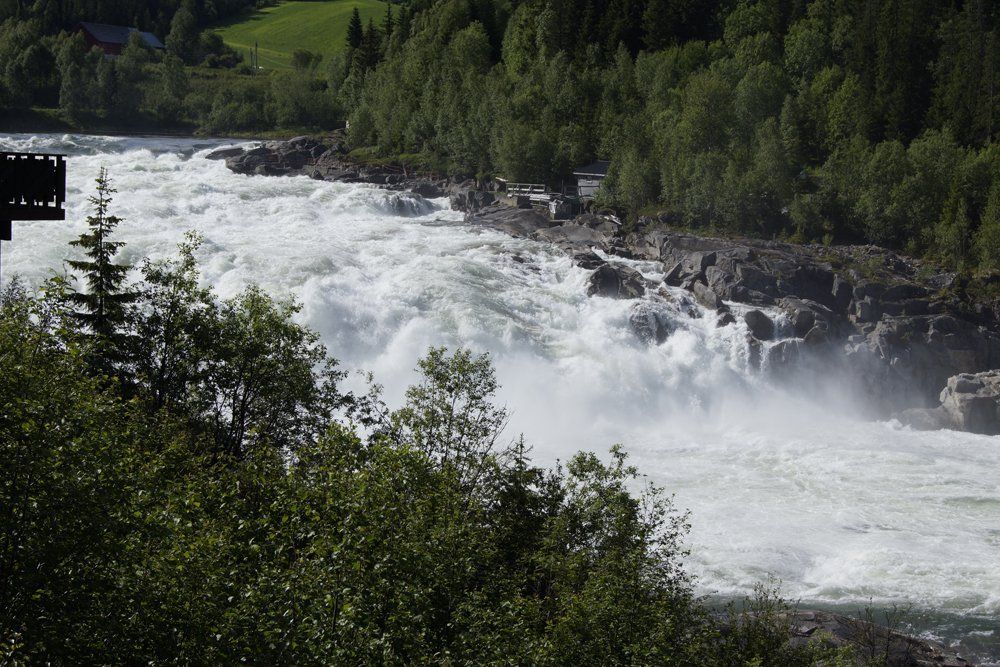Morgens wieder früh wach.. mein Rücken.. das sollte sich den ganzen Urlaub durchziehen.. das eine oder andere mal gab es eine Tablette. Also wieder mit dem Hund raus und dann Frühstück vorbereitet. Die Sonne schien und ich war bereit... Michael nicht! Der fluchte, Urlaub und dann so früh raus.. Früh hieß dann 7:30 Uhr. Man muss aber dazu sagen, dass er in verschiedenen und unregelmäßigen Schichten arbeitet und im Urlaub einfach mal seine Ruhe haben will.. wenn da seine Perle nicht wäre.. also grummelnd am Frühstückstisch gesessen..nach dem Kaffee ging es dann besser:-) Dann ging es los, nochmal schnell Bilder am Tor zu Nord-Norge gemacht und dann ging es los. Wetter war heute super. Am Laksfossen machten wir Stopp und schauten uns dieses gigantische Naturschauspiel an. Irre, was da für Massen an Wasser runterkommen!