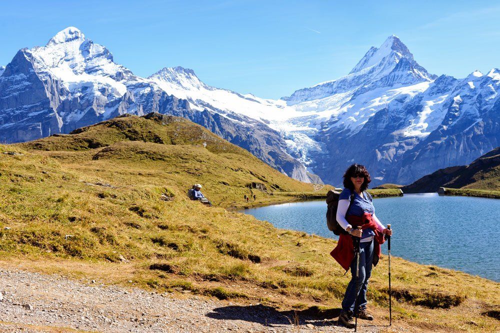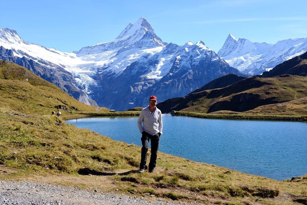 Wir lesen zum Bachalpsee dauert die Tour 50 min, och das nehmen wir mit. Ich muss dazu sagen, ich hatte im März einen Skiunfall und so ziemlich alles kaputt im Knie, seit ca 4 Wochen kann ich erst richtig belasten und für mich sind die 50 min gerade das Höchste der Gefühle. Eine sehr schöne Tour, leider ist der See wellig, so dass man nicht richtig die Spiegelbilder machen kann und ich habe extra meine Nikon D800 mit einem 70 - 200 Zoom Obketiv mitgenommen, das heißt Michael trägt den schweren Rucksack. Festgestellt haben wir, dass unsere kleinen Kameras auch gute Bilder machen und das Nikon Objektiv gar nicht sooo super geeignet ist. Das schleppe ich nicht mehr mit. Wir machen ein paar Bilder und eine Rast, stärken uns und dann geht es wieder zurück. Dann fahren wir auf die Station Schreckfeld da kann man so schon auf die Nordwand schauen und gönnen uns ein Bier.